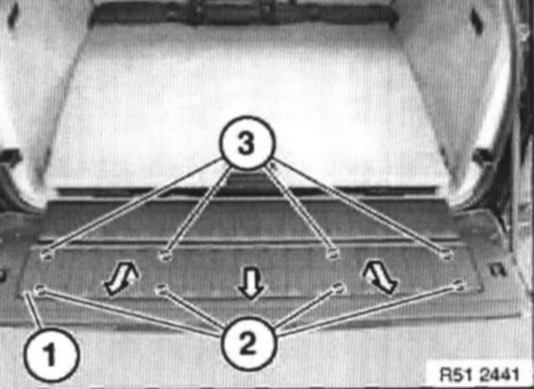 If necessary, replace faulty retainers (1) and rubber parts (2) on rear lid lower section (3).