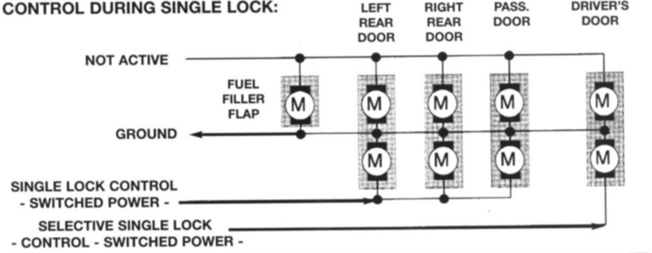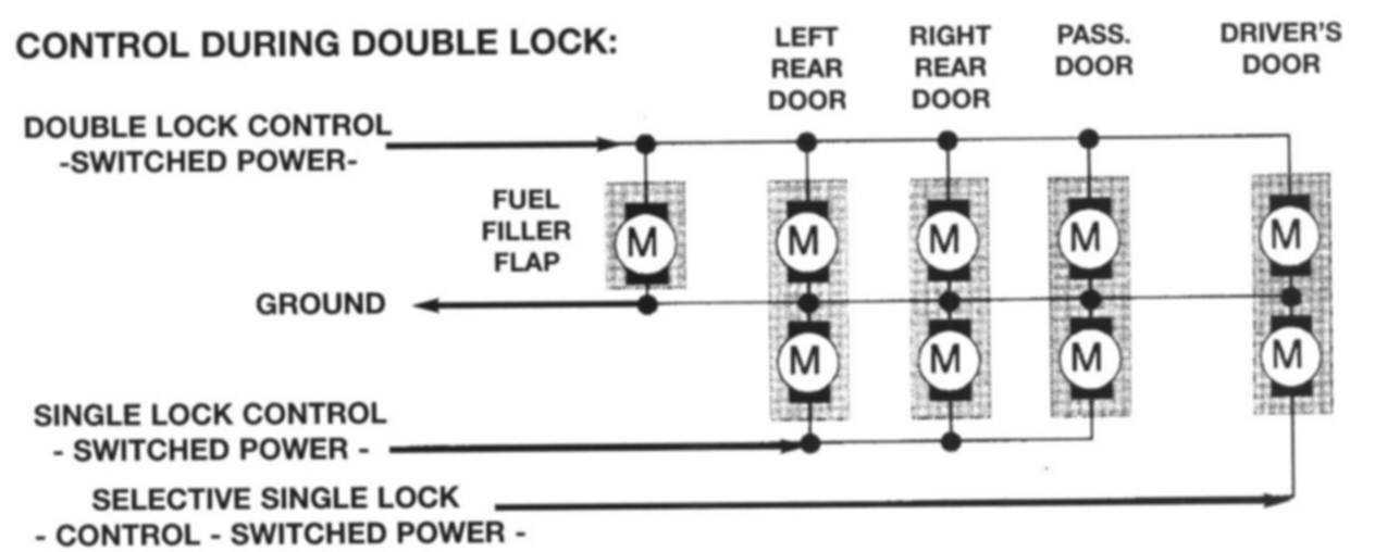 All door lock actuators and the fuel filler flap actuator are controlled directly by the GM via tour internal load relays The drivers door lock actuator has a separate circuit for the selective unlocking feature