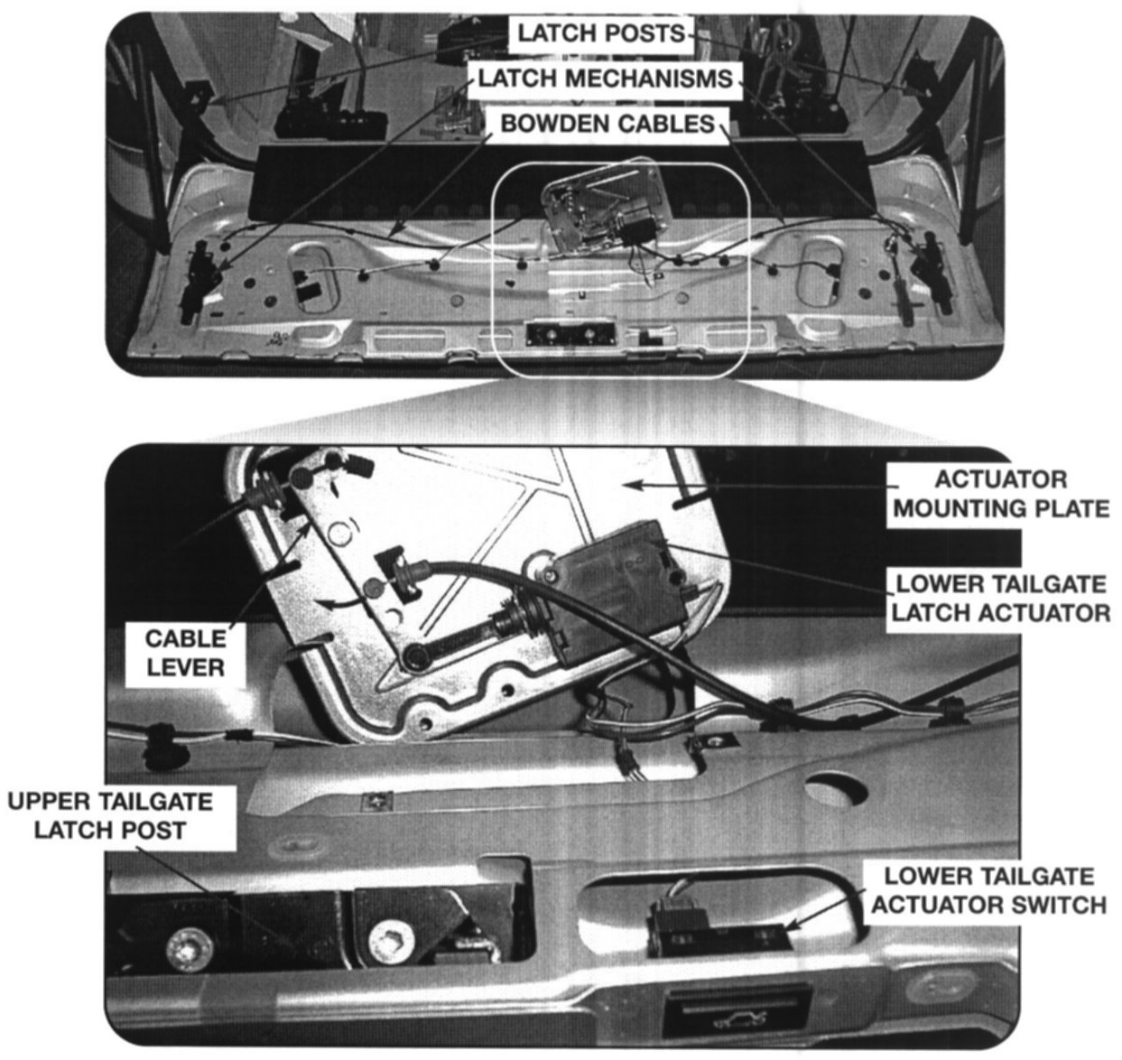 The lower tailgate actuator operates a lever which pulls two bowden cables to unlatch the outboard mounted latch mechanisms. The upper and lower latch mechanisms can also be manually unlatched for if electrical malfunction occurs (refer to complete vehicle section).