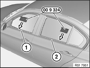 Insert special tool 00 9 324 at rear (at C-pillar) in window cavity (2) (letters TOP pointing upwards).