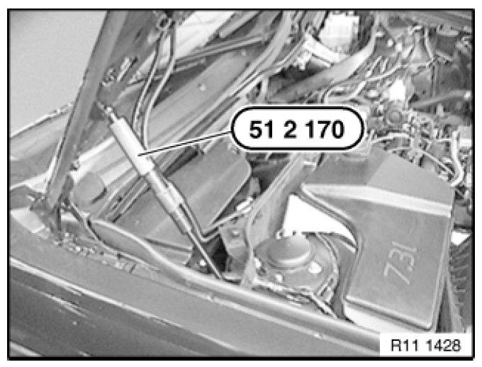 Hold engine hood, unhook damper on hood. Open engine hood fully and reattach damper with special tool 51 2 170 to hood.