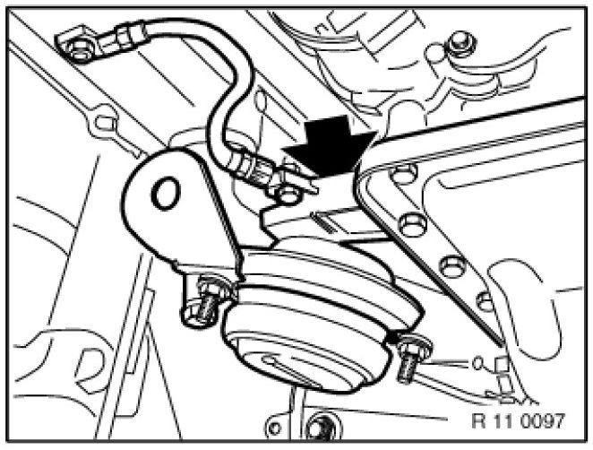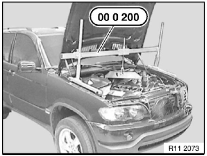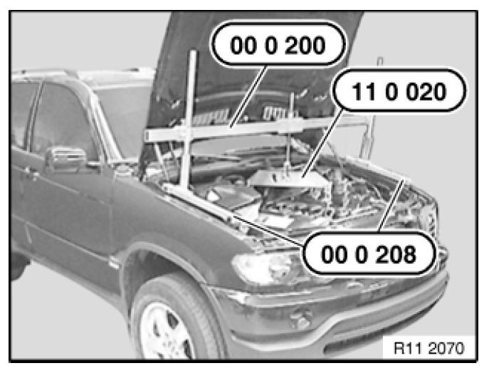 Secure special tool 11 0 020 to front and rear engine suspension eyes.