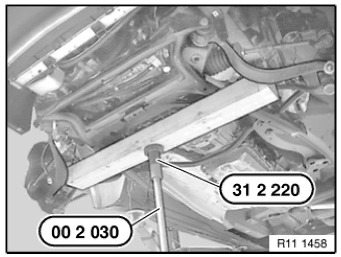 As shown in illustration, support front axle support with special tool 00 2 030 in conjunction with special tool 31 2 220 and a block of wood.