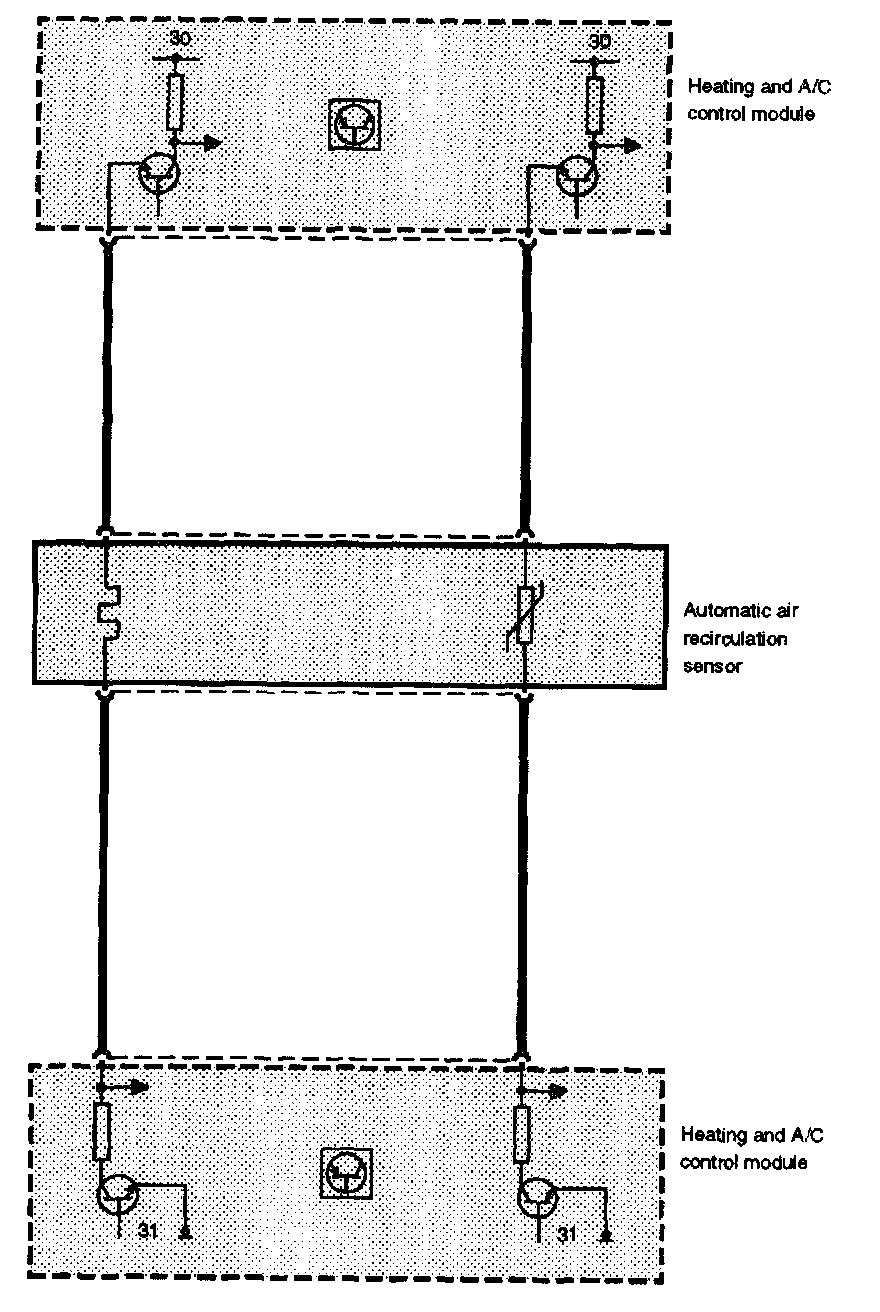 The IHKA control module monitors the change in the voltage signal as these gasses influence the sensor. The second circuit shown is a heating circuit which enhances the sensor's reaction time. When starting the vehicle, fresh air is always supplied for 90 seconds due to the AUC sensor heat-up time.