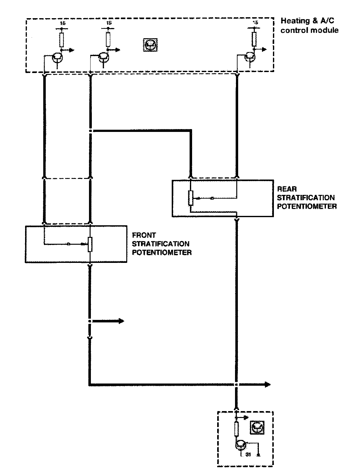 The request for air temperature stratification is made by a thumbwheel located in the front center face vent outlet and the rear passenger console outlet (if equipped). The thumbwheel potentiometer receives power and ground from the IHKA control module which also monitors the variable return voltage. In addition, the rear console outlet contains a micro-switch (on/off request) that signals to the IHKA control module to allow air flow to the rear console.