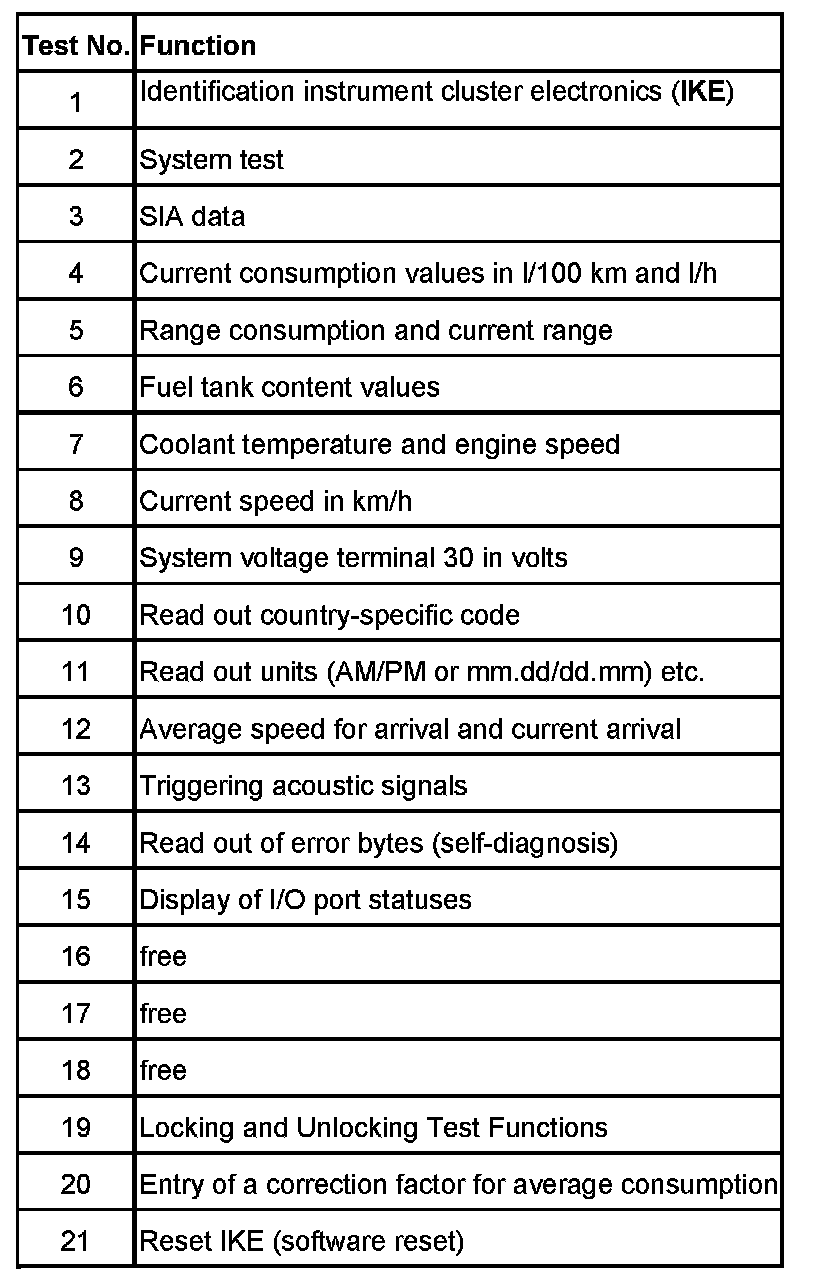 System test (Test No. 2): The system test serves the purpose of testing the display unit together with its elements controlled by the instrument cluster electronics (IKE).
