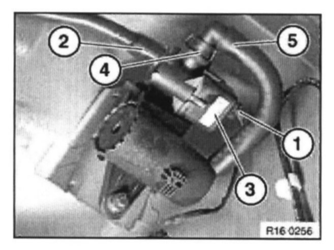 Lift bracket (1) with leakage diagnosis pump (3) and dust filter (4) out of mounting (2).