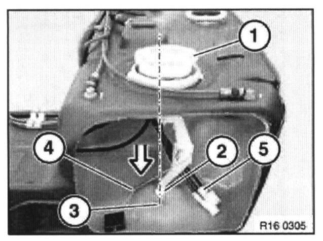 3. Fuel level sensor flange must remain in pressed-in position! When the flange is partially pressed out, the sensor toot (2) is not in the recess (3) in the bottom of the fuel tank.
