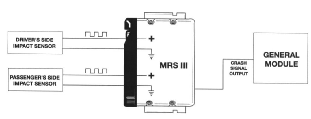 The satellite sensors are mounted below the driver's and passenger's front seats on the seal frame. The function of the sensors is to detect the severity of side impacts and signal the MRS III control module, through a pulse modulated signal, in the event of a crash. The control module uses this input signal along with its internal impact sensor signal to determine the deployment of the side/head airbags.