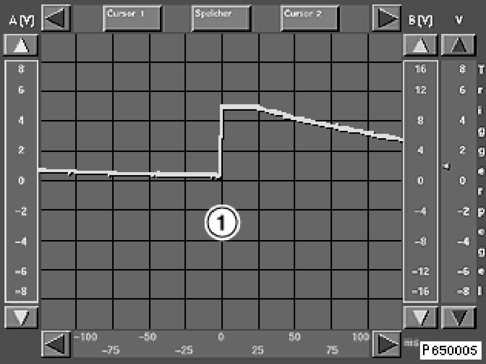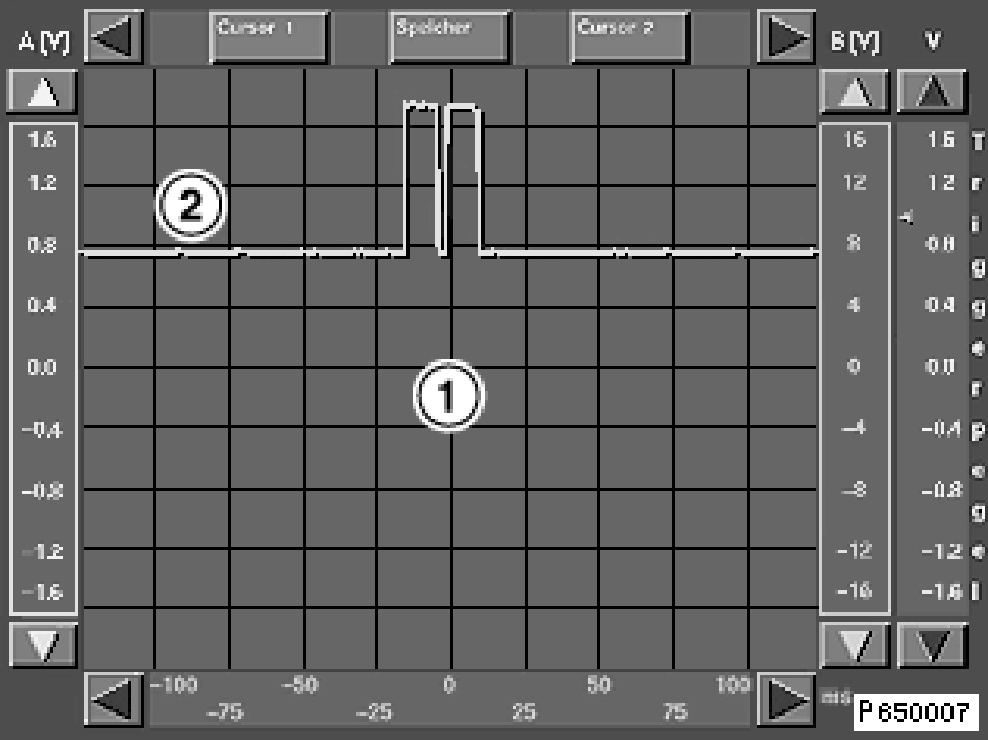 The 4-pin adapter lead 61 6 032 must be used for the measurement. The adapter lead must be attached to the connector on the seat belt buckle and the wiring harness. The multifunction cable MFK1 is connected to the adapter pin 1 (terminal 31) and adapter pin 3 (cable to MRS control module). The oscilloscope is set by the test module.
