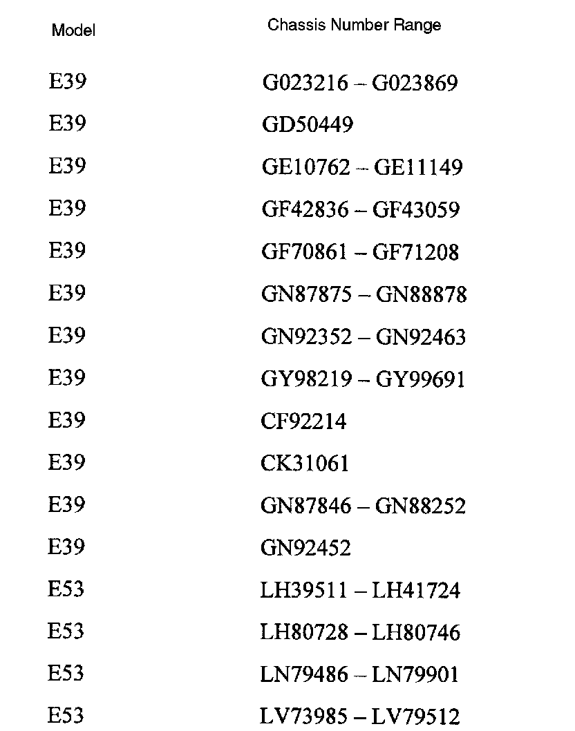This Service Action involves E39 (5 Series) vehicles which were produced from September 2002 up to November 2002 and E53 (X5 Series) vehicles which were produced from October 2002 up to November 2002.