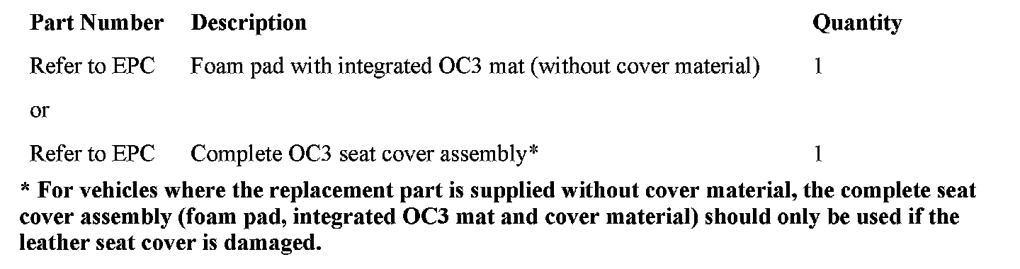 Note that replacement parts for some vehicles are supplied without the cover material (foam pad with integrated OC3 mat). In this case, remove the cover from the faulty seat and reinstall on the replacement part per RA 52 13 400.