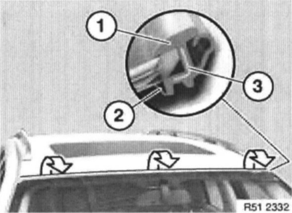 Cut through tear-off lip (2) on new rubber frame (1). If adhesive has reached rib (3) through tear-off lip (2), this area must be cut out partially.