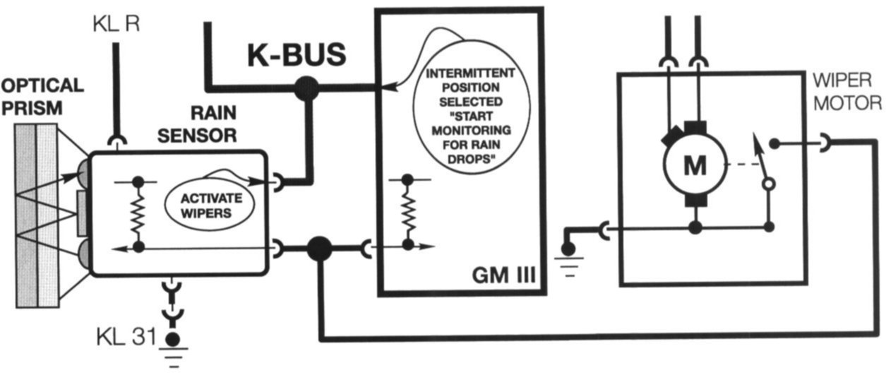 - As an acknowledgement, the rain sensor sends a command via the K Bus to activate the wiper motor. If more than 12 seconds pass before the GM receives the acknowledgement, the GM concludes the rain sensor has a defect and operates the intermittent wipe function as a system not equipped with a rain sensor. The wiper intermittent cycling is based solely on the knurled wheel setting.