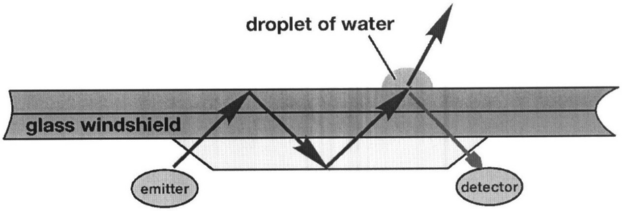 The beam is reflected back into the windshield due to the density difference of the glass compared with the ambient air on the outside surface of the glass. When the windshield is clean (no rain drops, moisture or dirt) the detector diode receives 100% of the infra red light that the was sent by the emitter. With this condition, the rain sensor evaluation electronics determines the windshield is free of rain drops.