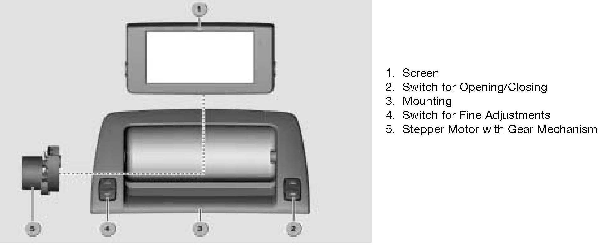When raised, the position is between 35-108 degrees. The position last stored (last function memory position) is raised. The display can now be finely adjusted in steps (1 step = 1.2 degrees) using the left hand switch. The signal from the switch is sent directly to the stepper motor and is not transferred via the Kbus.