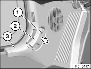 Remove hood/bonnet actuating lever (2) in direction of arrow from panel (3).