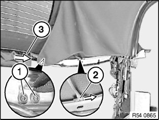 Feed front strap (2) and cover (3) out of convertible top strip.
