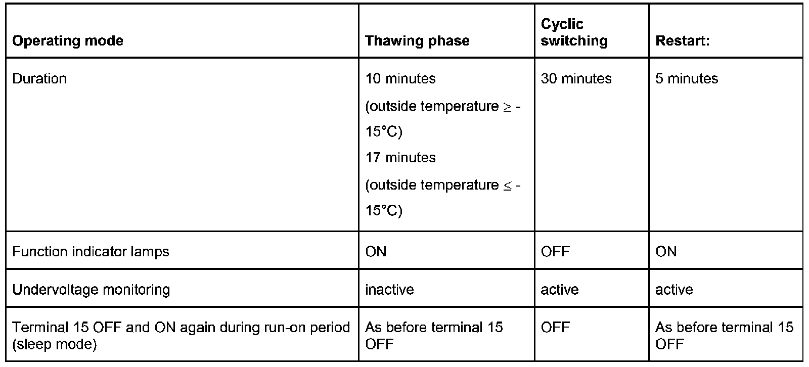 This mode takes place with one third of the total power output of the rear-window defroster (pulse/pause ratio = 40 seconds ON / 80 seconds OFF). Cyclic switching is deactivated from terminal 15 OFF.