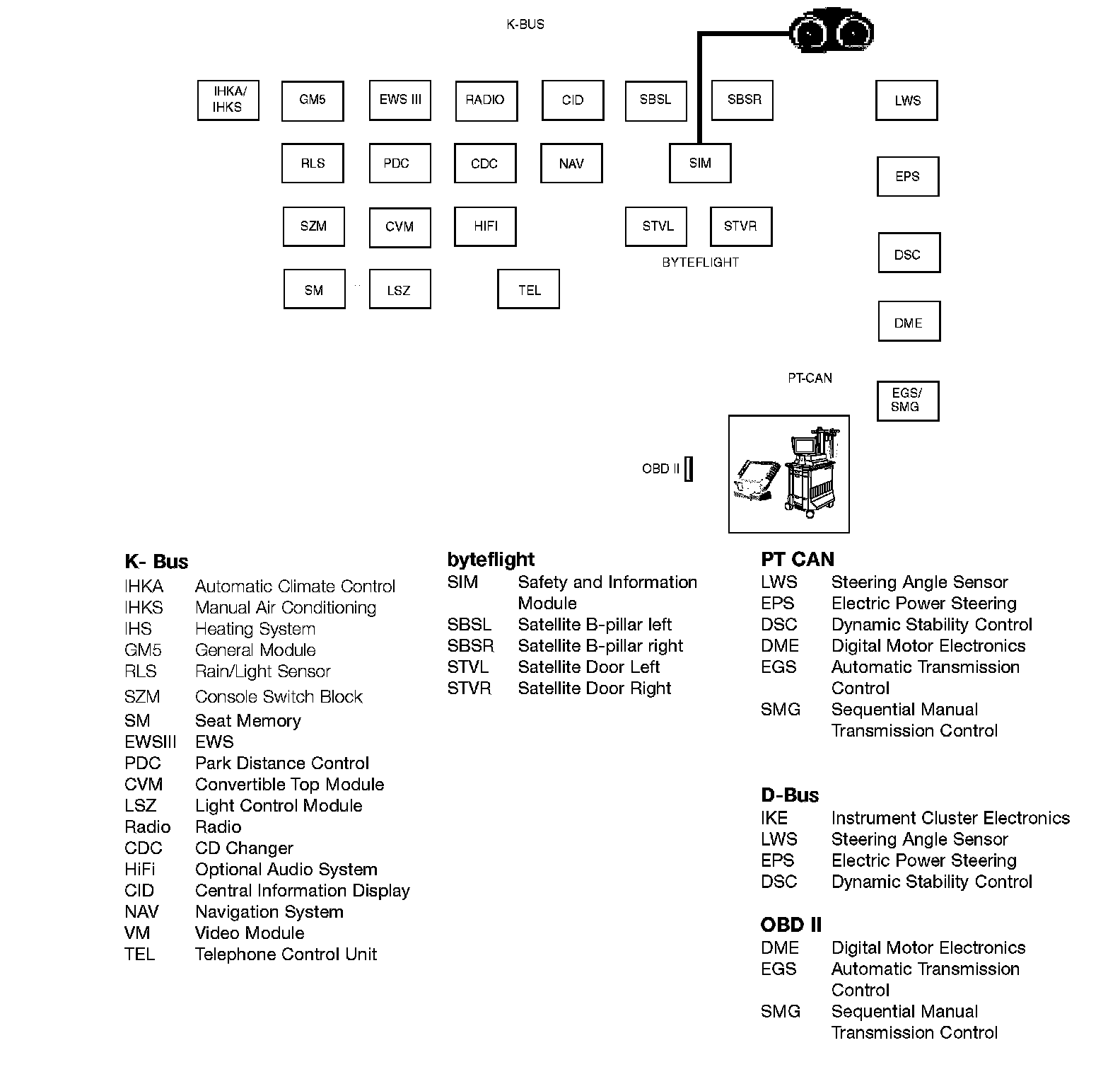 The bus system of the (E85) Z4 is based on the K-Bus, PT CAN and the D-Bus of the E46. The byte flight optical bused system is based on the E65.