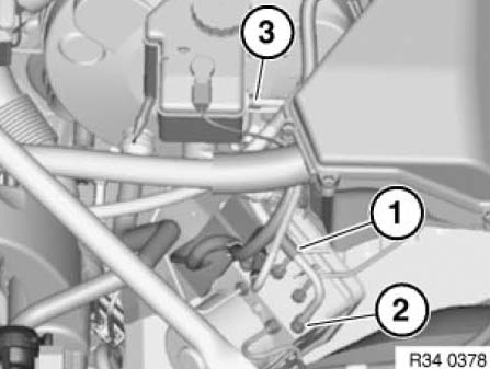 Release and remove pipe (1) from hydraulic unit (2) and from brake master cylinder (3).