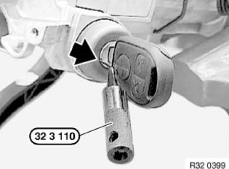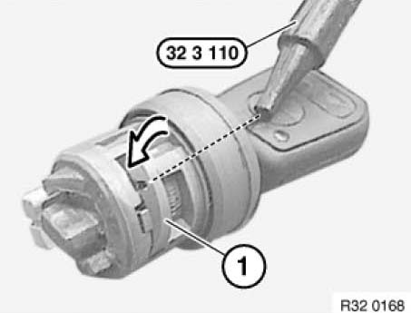 Note: The lock (1) is unlocked with special tool 32 3 110 and the locking cylinder can now be removed. If necessary, turn special tool in hole.