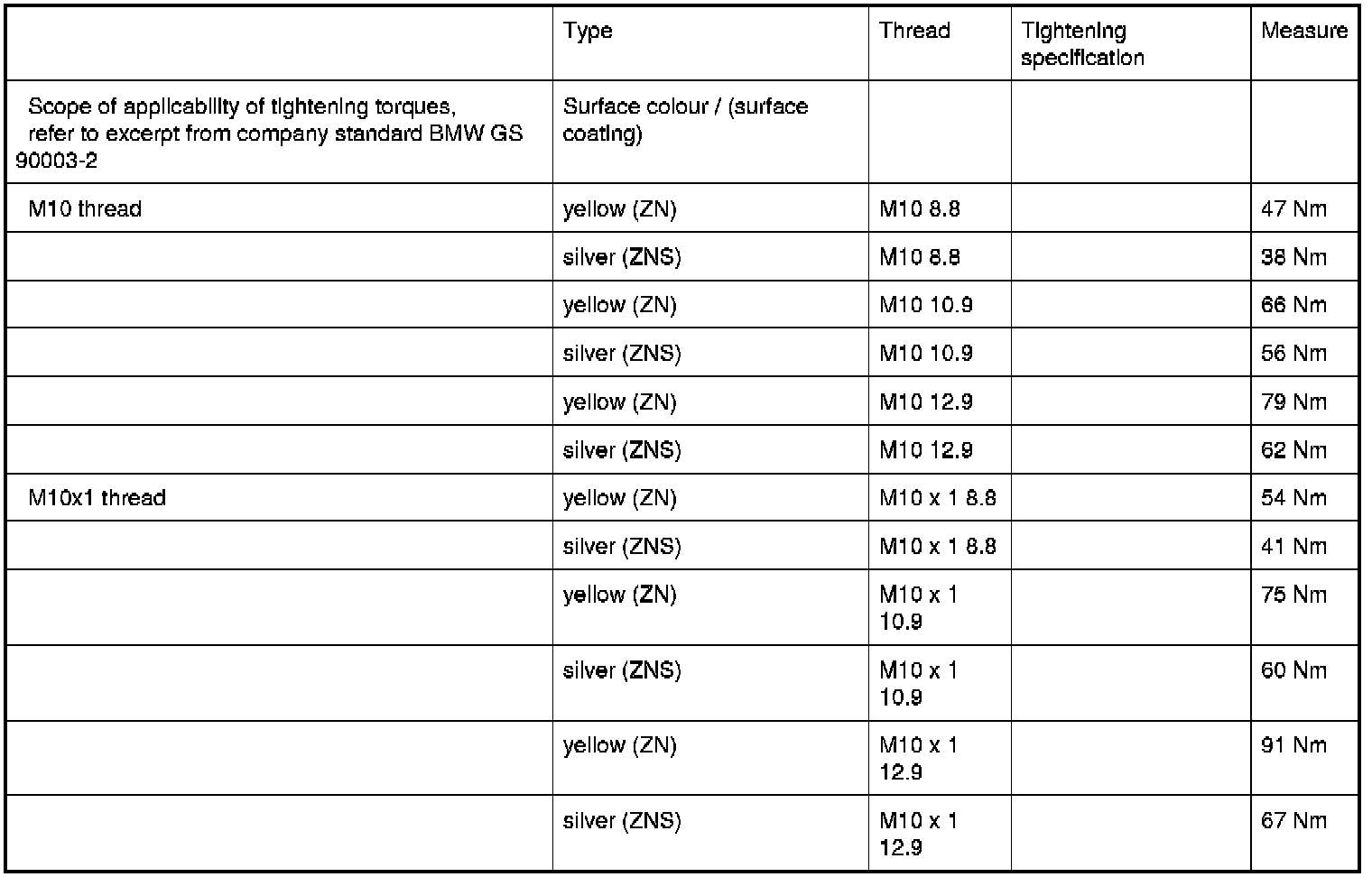 M10 and M10 x 1 - Maximum Tightening Torques Acc. to BMW GS 90003-2