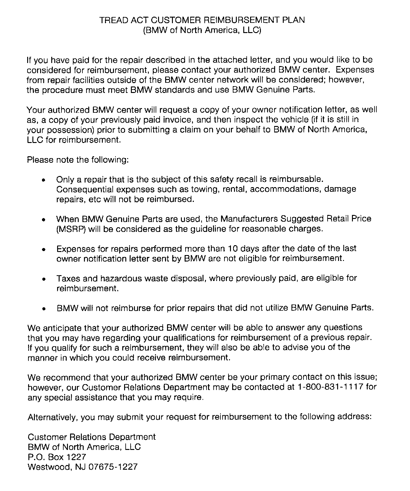 Customer Reimbursement Plan Letter