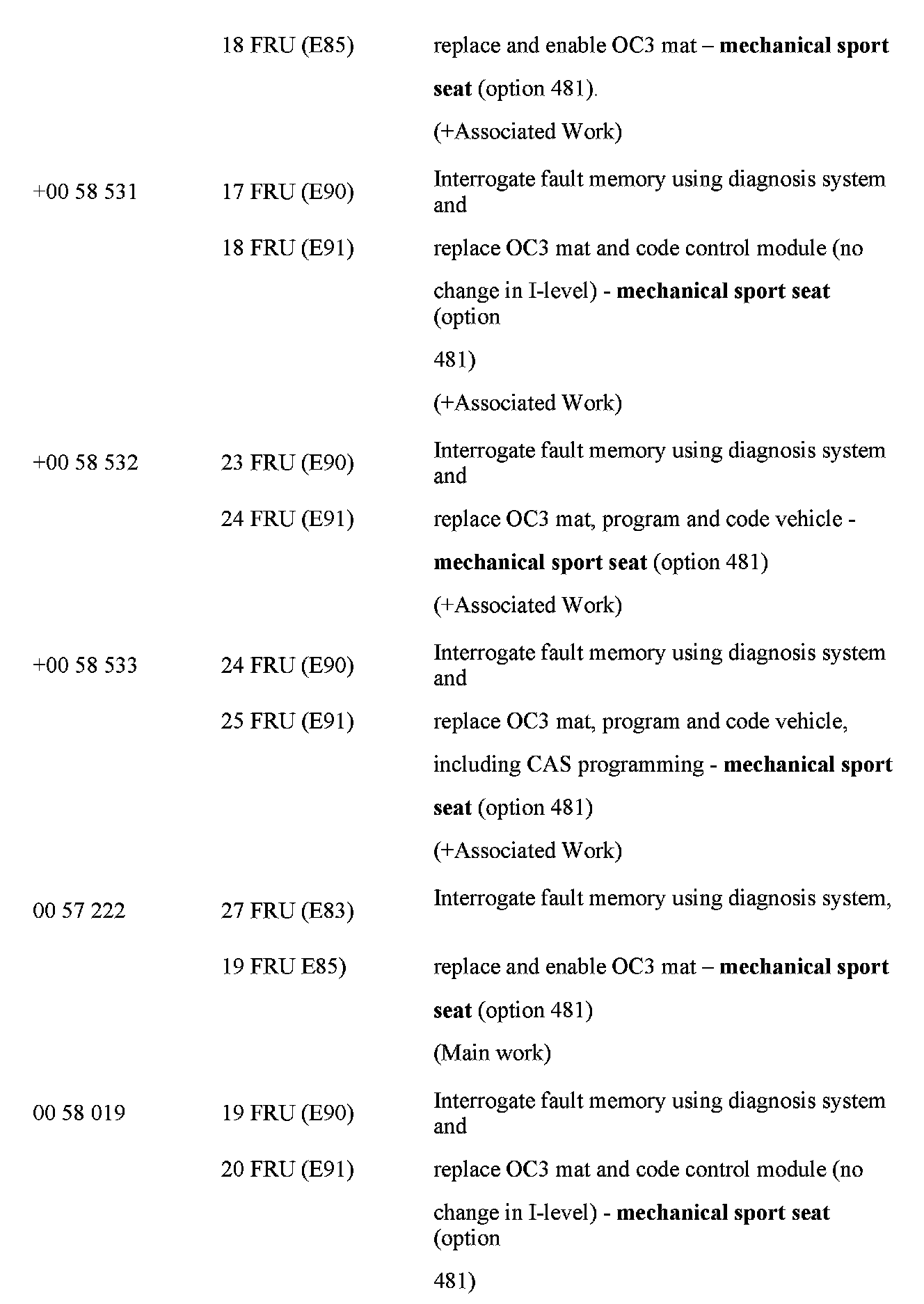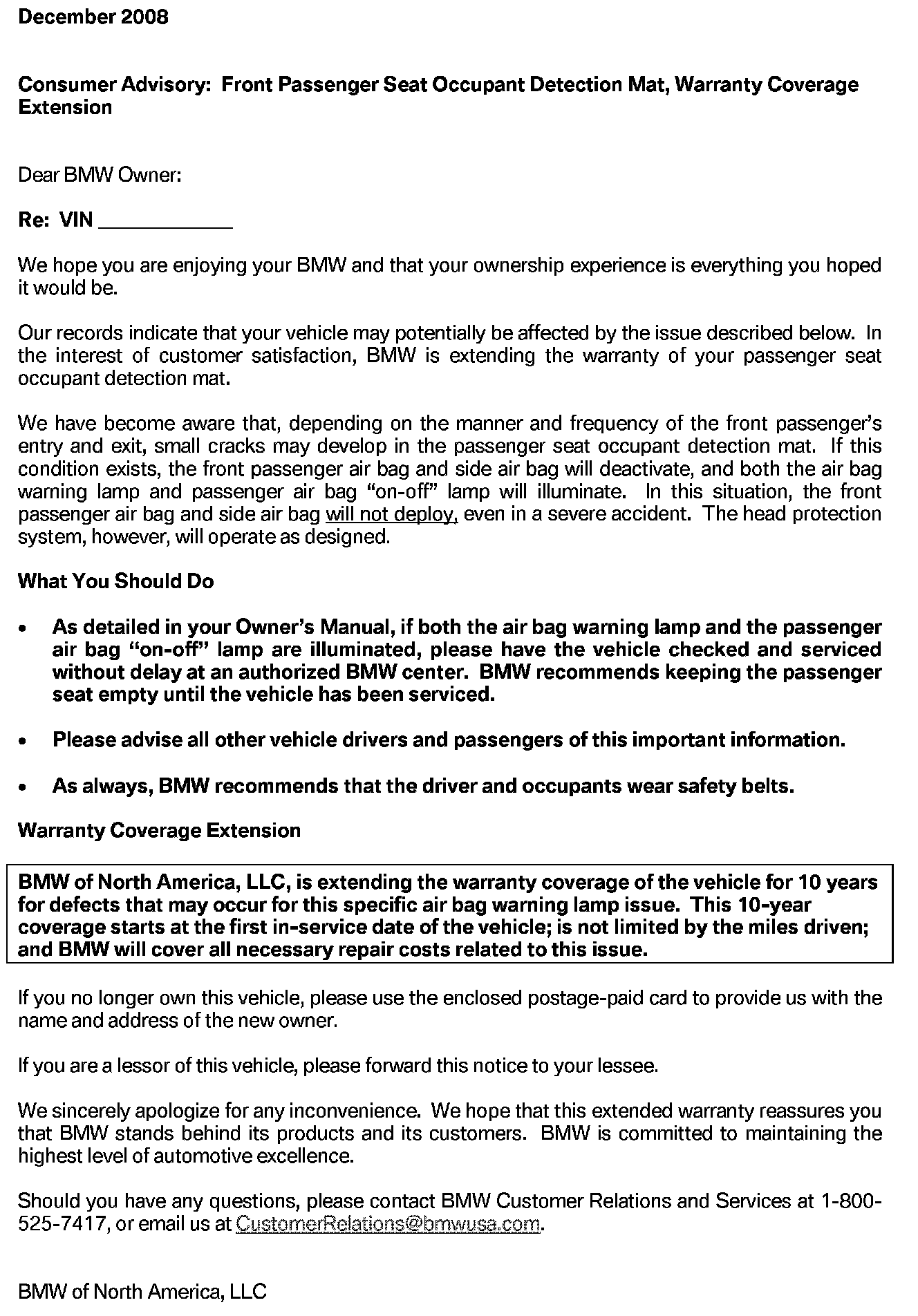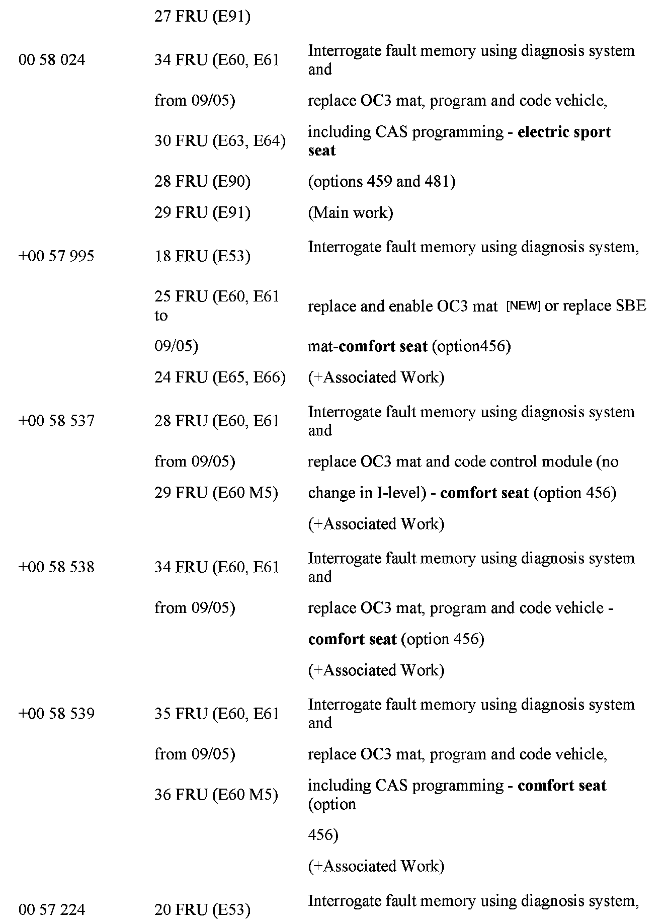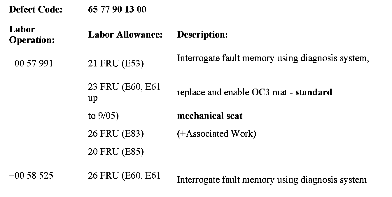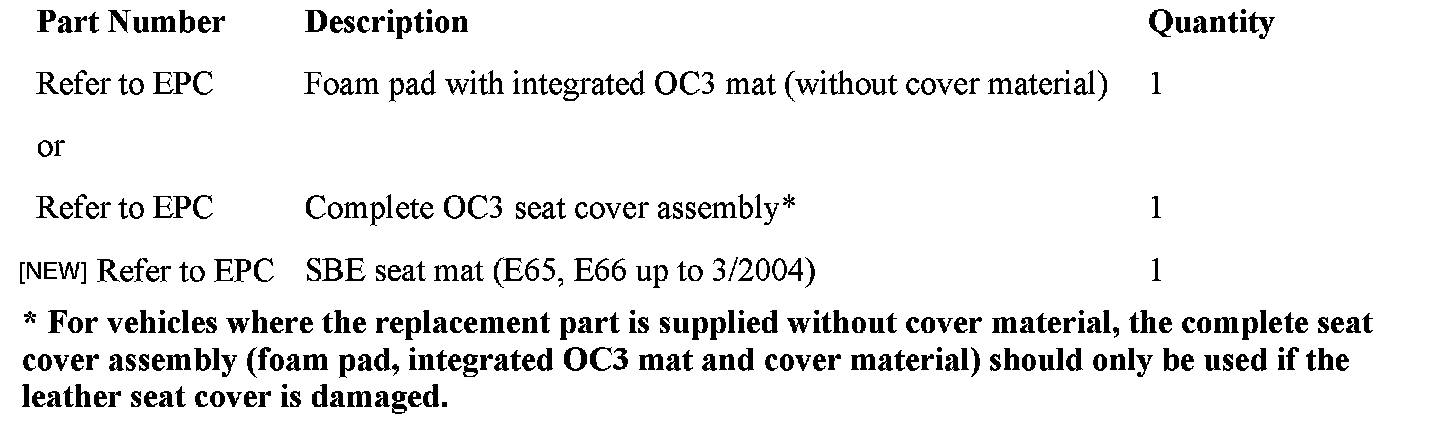 [NEW] Note that on E65 and E66 vehicles, the OC3 mat was introduced from 03/2004. Earlier vehicles had an SBE seat occupancy detection system. However, letters were mistakenly sent to owners of all vehicles up to 11/2005. Therefore BMW will honor this extended warranty for seat mat defects on the