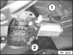 IMPORTANT: Disconnect plug connection (1) from power window motor (2) (risk of trapping).