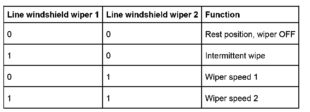 The output WI 1 (signal name) at the general module switches on the wiper. The output WI 2 (signal name) switches the wiper motor to stage 2.