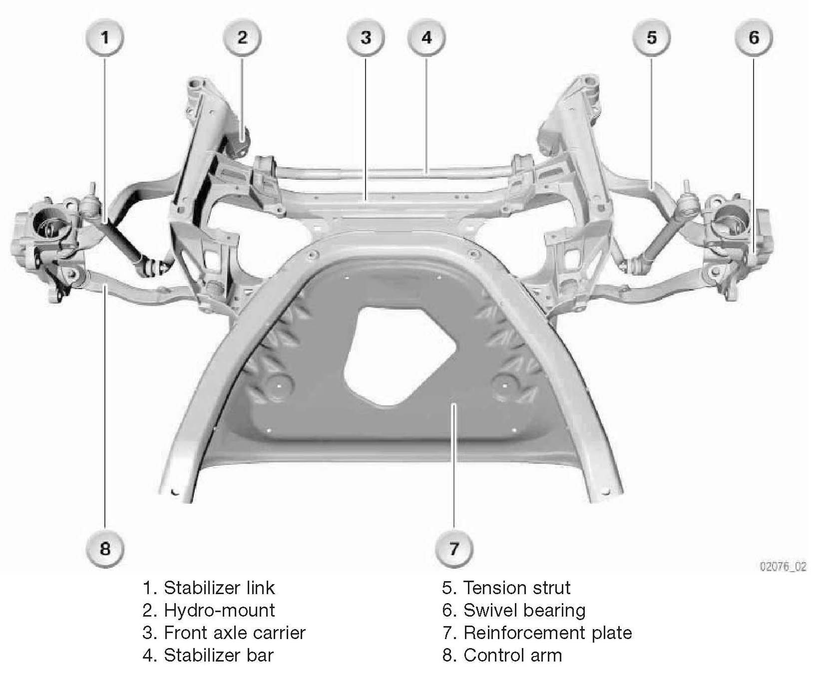 Front AxleThe double-joint spring strut axle with tension struts is essentially the same as the front axle of the E65. The complete front axle is made from aluminum. It has been possible to save on weight and space compared with the E39 thanks to the use of the reinforcement plate. The reinforcement plate ensures a high degree of transversal vehicle rigidity.