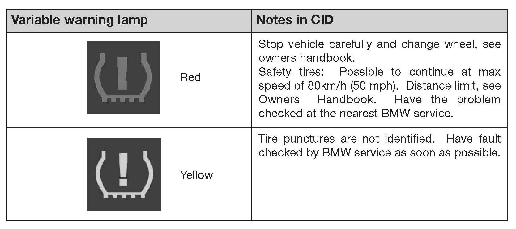 ^ Run Flat Indicator failure signals that the system is inactive due to a fault and can not detect any tire failures.