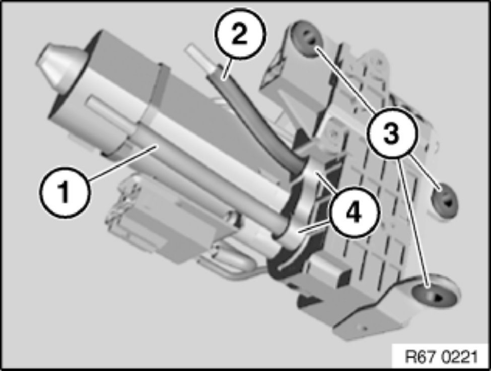Detach drive shafts (1) and (3) from associated mountings (2) and remove drive unit for electric steering column adjustment (4).