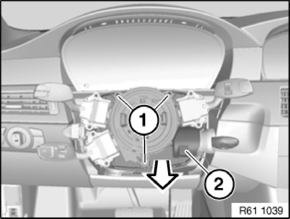 Pull back fixture for steering column switch (2) in direction of arrow.