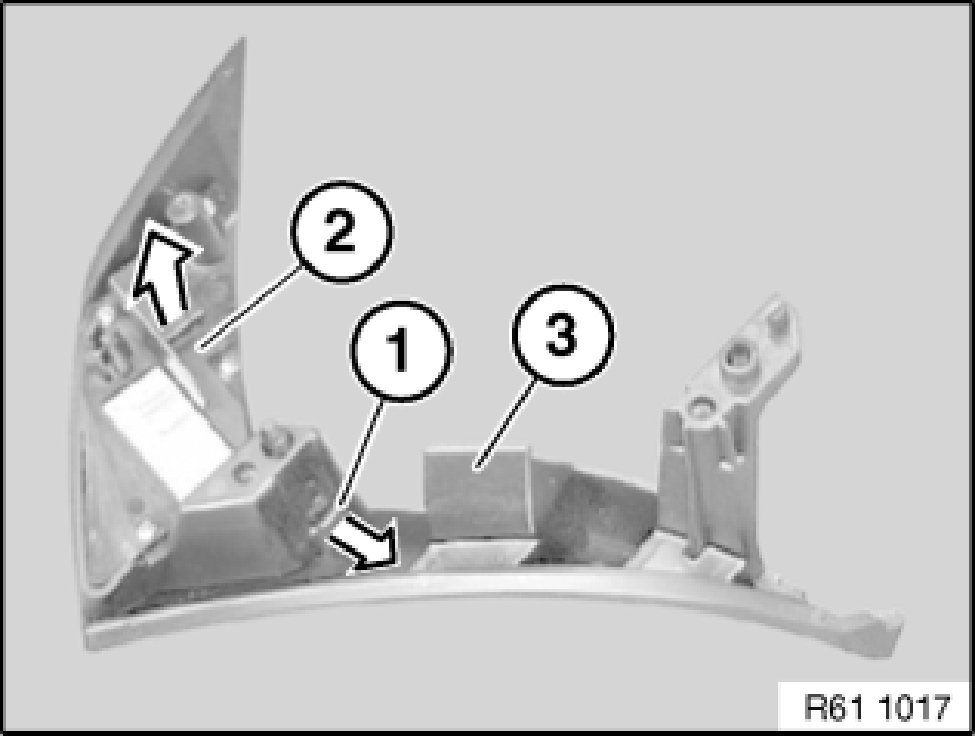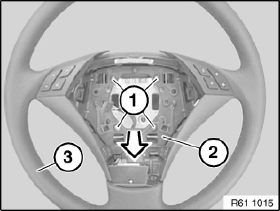 Unlock catch (1) and remove right multifunction steering wheel switch (2) in direction of arrow from decorative strip (3).
