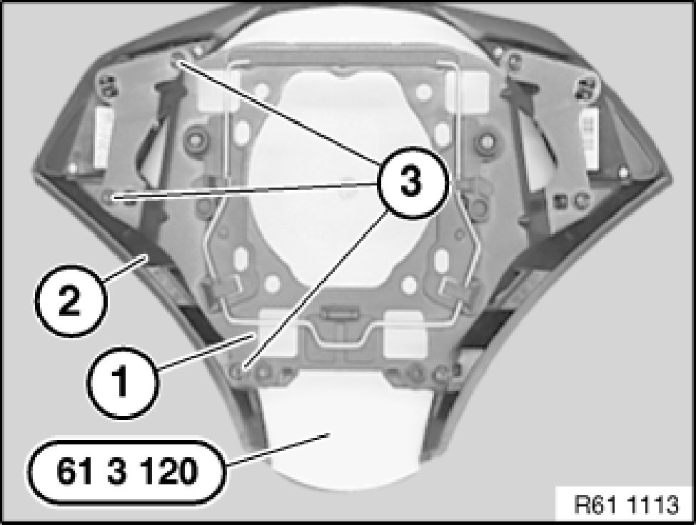 - Fit steering wheel retaining plate (1) with decorative strip (2) not yet screwed down on special tool 61 3 120.