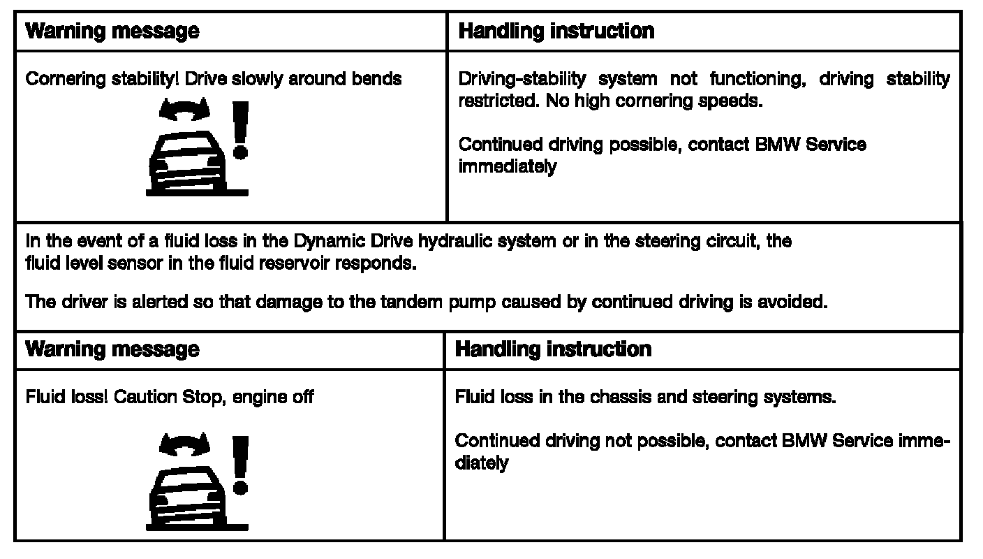 Although the Dynamic Drive function is not impaired, the driver receives the display Chassis control comfort restricted. He/she is prompted to visit a garage/workshop at the next available opportunity.