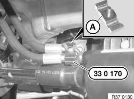 2. Clamp special tool 33 0170 to pressure lines and secure. Here, side (A) with smaller notch must come into contact with hose adapter.