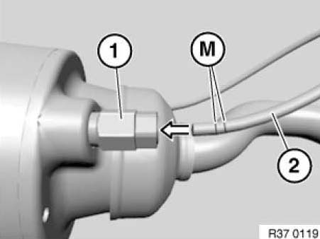 Push distribution hose (2) into vent valves (1) up to middle between markings (M).