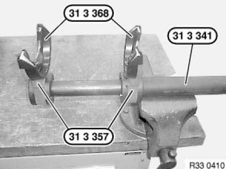 Position special tools 31 3 357 with protective inserts 32 3 368 from above on special tool 313 341 until locking pins can be felt and heard to snap into place.