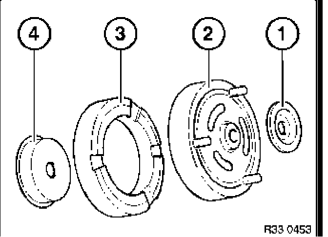 Check support bearing (2), upper spring pad (3) and support element (4), replace if necessary.