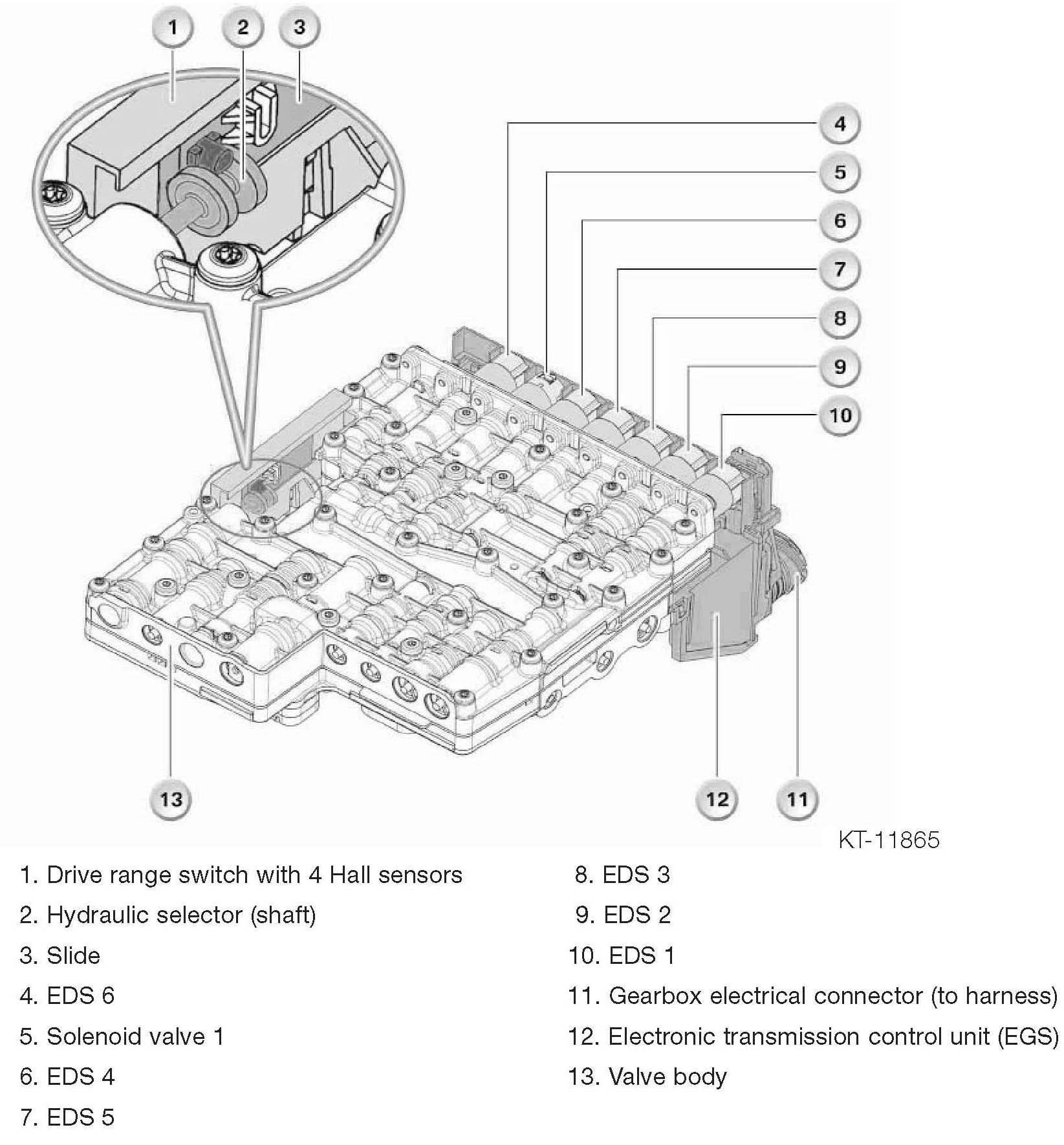 The hydraulic valve body contains valves, springs, dampers and electric solenoid valves. The electronic control module manages the complete electronic control of the transmission and is an integral part of the valve body (replaceable as a complete unit). The electronic control module is completely sealed and oil tight.