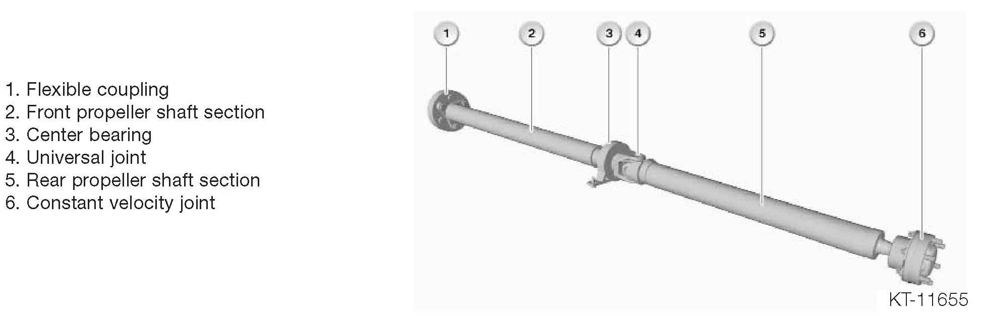 The propeller shaft is equipped with a crash element that is located at the center bearing on the front section of the propeller shaft. In the event of an accident, the engine/gearbox unit or the rear axle is displaced, the bearing journal (3) is pressed into the propeller shaft (see item 1) specifically reducing the impact energy.