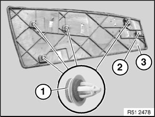 If necessary, replace faulty clips (1) with sealing washer and retainer (2) on carpet (3).