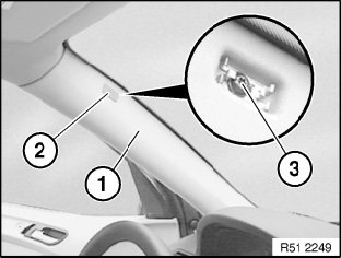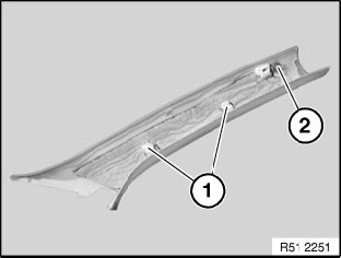 Align plastic lug (2) to retainer in A-pillar.
