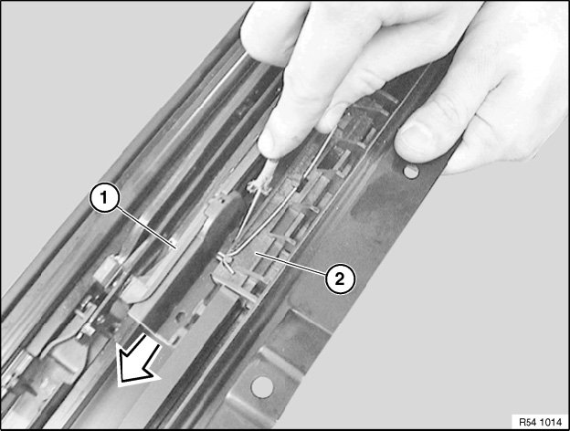 Pull control carriage (1) for wind deflector towards rear out of rail and remove.