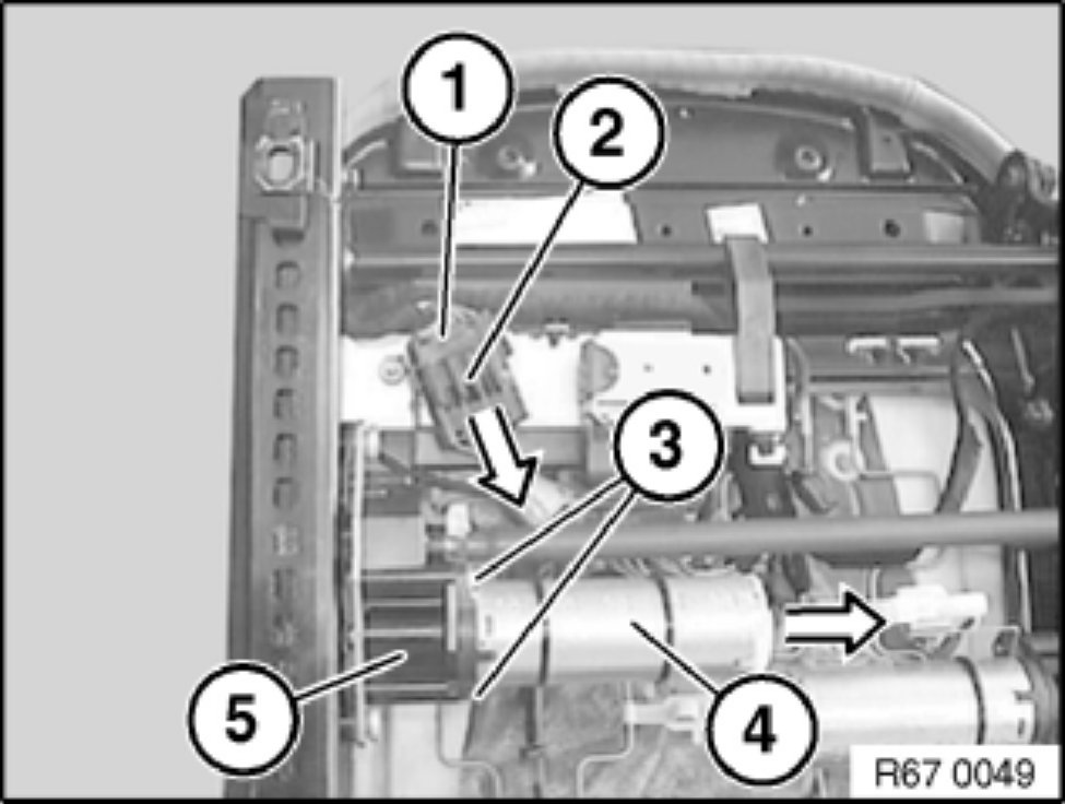 Release screws (3) and remove drive for longitudinal seat adjustment (4) in direction of arrow from flange (5).