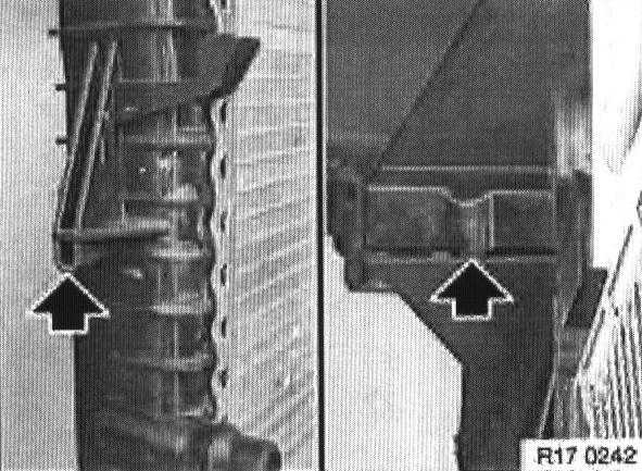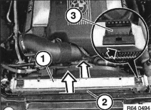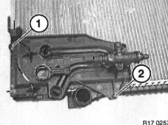 Remove heat exchanger (2) for automatic transmission fluid from mounting plate on radiator.