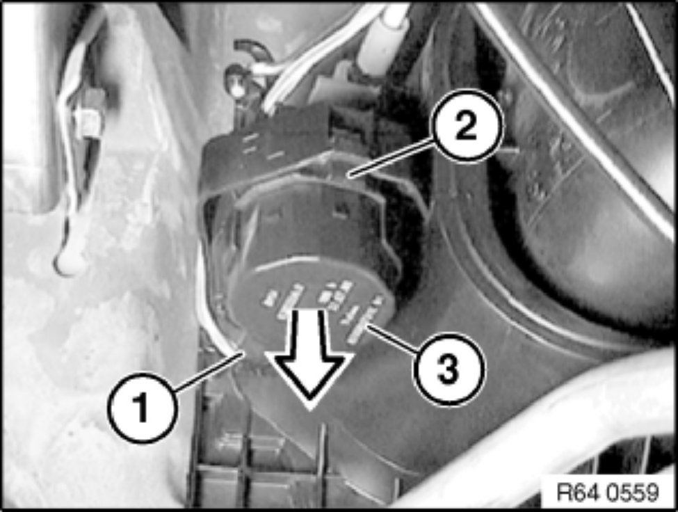 Unclip air duct for footwell on left (2) at mounts (1) and remove in direction of arrow.